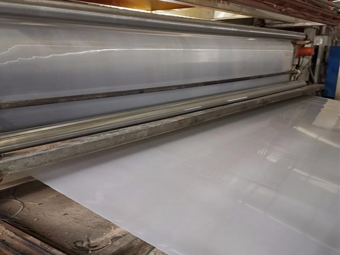 EVA防水板生产工艺采用国内两段共挤单摞杆挤出法生产,由原料树脂EVA加入增强剂、抗氧剂,经加热熔融、塑化、挤出成形、牵引后形成的板材,也可与穿好吊带的土工织物(信号层)热合成一体,形成复合防水板,也可采用挤出压延法,即将树脂挤出机熔融塑化,从机头狭缝模口挤出熔融状的片坯与吊带融合一体,经辊筒压延冷却成光膜,或与穿好吊带的土工织物融合一体,经辊筒压延冷却成复合防水板材。