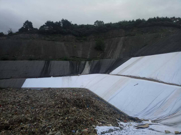 然后是铺设HDPE高密度聚乙烯土工膜。欧洲早在上世纪80年代开始用HDPE高密度聚乙烯土工膜,也叫HDPE防渗土工膜,又叫防渗膜,用于垃圾填埋场的防渗工程中。随着我国对生态环境的重视,以及国民环保意识日益提高,防渗膜在垃圾填埋场处理得到广泛的应用。将HDPE防渗膜铺设在膨润土防水毯上,拉伸平整,不得有大的气泡,压平整,避免挖掘机等重型机械在铺设的防渗膜上碾压或转弯、行走;防渗膜与防渗膜搭接边缘不低于十公分,边缘应保持干净无杂物、石子;然后准备焊接,焊接前先拿一米左右两块土工膜试焊一下,调整焊接机的合理温度,然后由专业焊接人员焊接;焊接应和铺设防渗膜同步进行,直到铺设完毕。注意:在土工膜铺设过程中,挖掘机在一旁均匀缓慢掂土将土工膜覆盖,焊接和填土同步进行是为了避免土工膜遭到人为破坏;封盖土工膜上的保护土层不低于三十公分厚度,防止植物根系刺破土工膜,然后将土层压实。