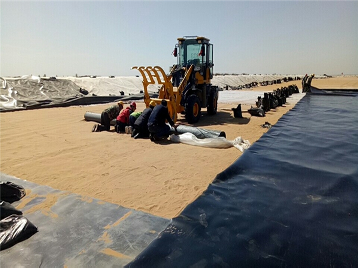 E、防渗膜片材铺设平顺、贴实、尽量减少褶皱:铺设后及时压载或锚固。